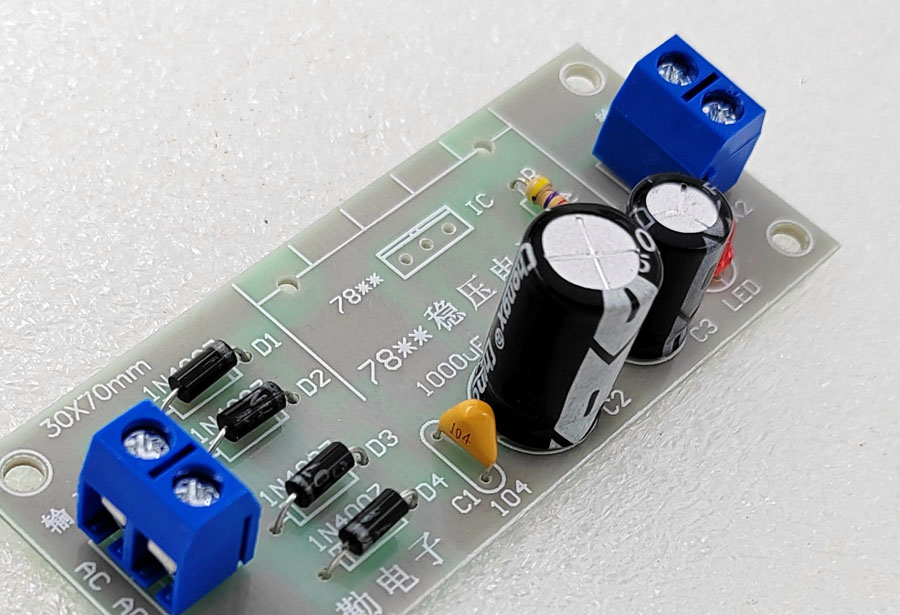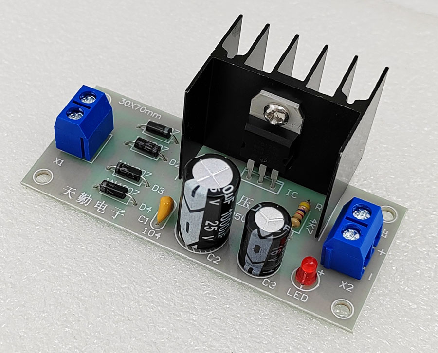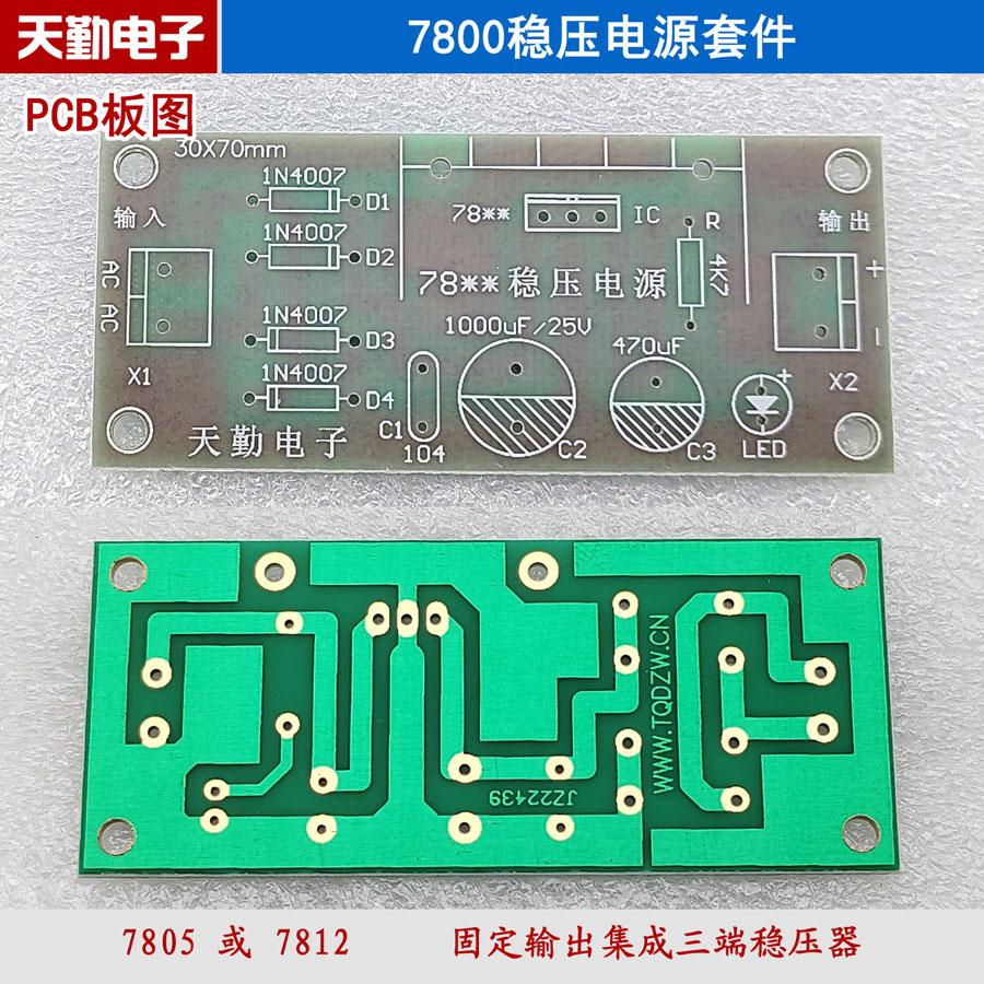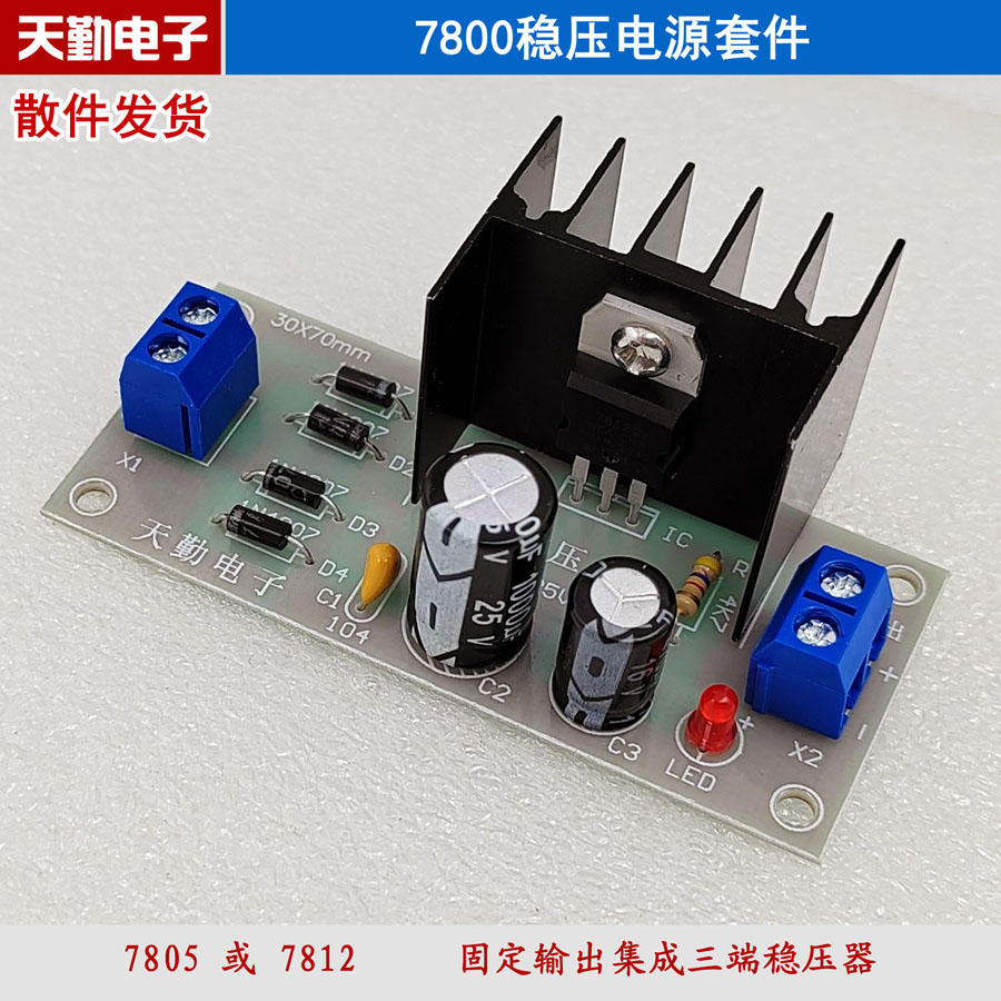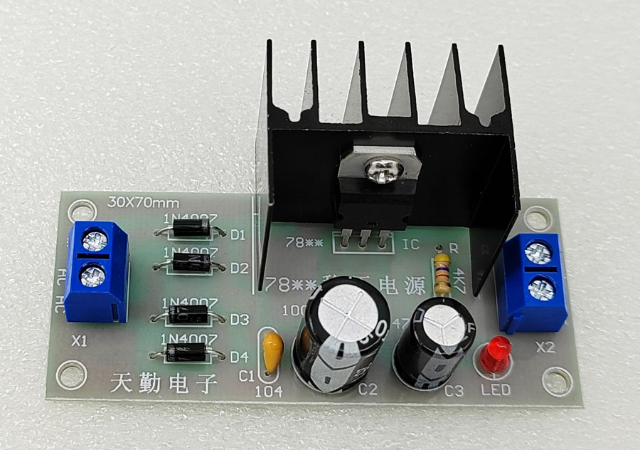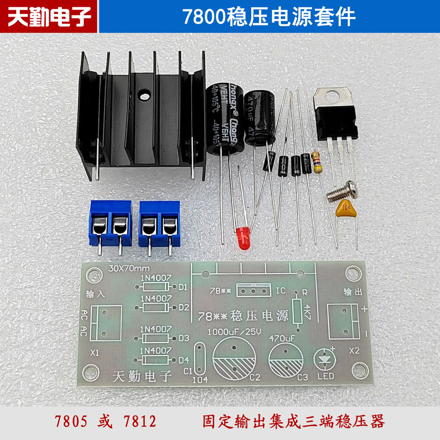 本套件配备7805(7812),是一个最常用的5V(12V)的集成稳压电路。