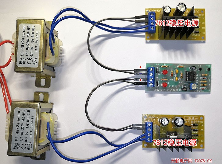 12、焊接完成检查无误后对电路进行通电调试,本电路要用双电源供电,如图示,采用了两套独立的7812稳压电源,构成了双12V直流电源。
